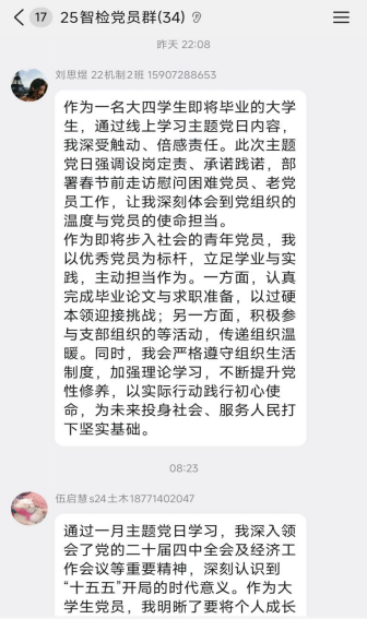 学生党员刘思煜在交流中谈道,本次线上主题党日学习让他深受触动,深切体会到党组织的温度与党员的使命担当。作为即将毕业的大四学生,他将以优秀党员为标杆,扎实完成毕业论文与求职各项准备,同时积极参与支部各类活动,以实际行动践行初心使命,为投身社会、服务人民打下坚实基础。