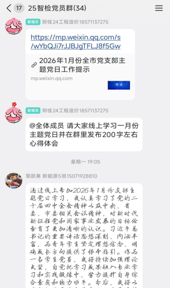 本次主题党日严格遵循“学做议述评”五项重点工作规范,以理论学习强党性、以实践要求提素质、以使命担当促作为,引导全体学员在沉浸式学习中筑牢信仰之基。线上学习环节结束后,学员们结合自身学业进展、专业特色与成长规划,在交流群内分享学习心得与实践构想,字里行间彰显出青年一代紧跟党的步伐、勇担时代重任的昂扬姿态与奋进热忱。