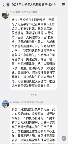 在交流发言环节,支部党员与入党积极分子结合专业学习、职业规划和自身实际逐一分享心得。党员马亚丽立足毕业求职关键阶段,表态将严格落实“设岗定责、承诺践诺”要求,在完成学业、备战就业的同时,主动参与关爱帮扶志愿服务,彰显党员先锋本色。入党积极分子金宏、吴潇晴分别结合智能制造、新能源汽车专业特点,表示将聚焦新质生产力发展方向,把一季度“开门红”的奋进姿态融入科创实践、专业学习和岗位实习,主动对接武汉产业发展需求,立志扎根武汉、服务地方。