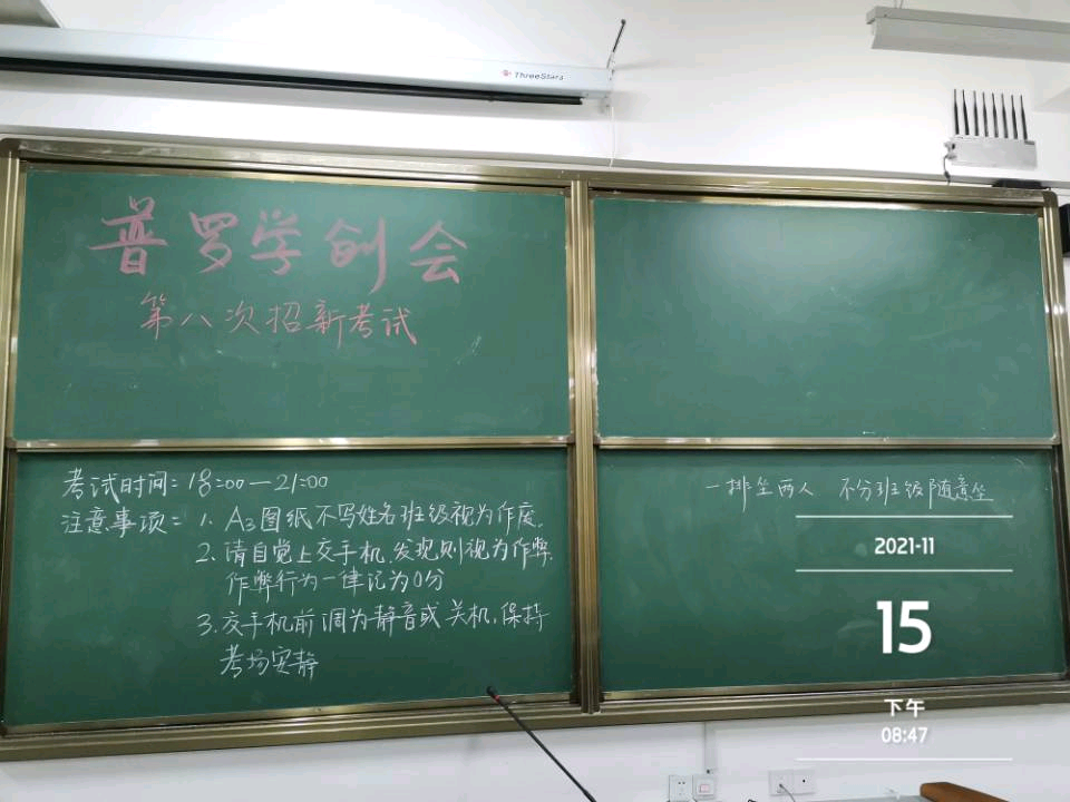 11月15日晚上6点,普罗学创会的招新考试在5栋201和202教室准时开始,大一新生积极参加本次考试。机建学院老师高度关注考试,本次考试由李潇老师出题,涵盖了大一新生目前学习的大部分内容,监考的同学全程认真巡视,考试圆满结束。
