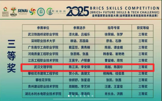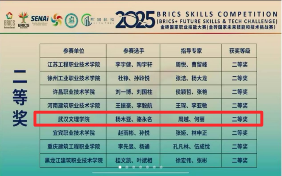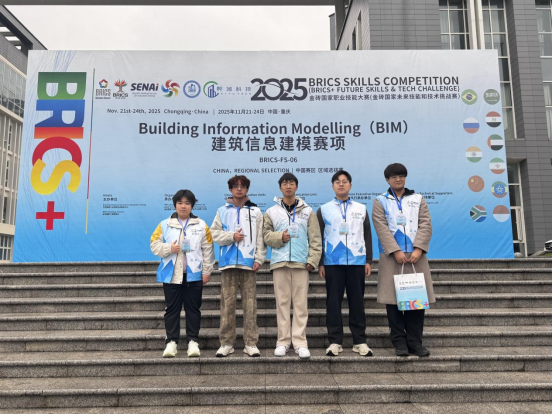 11月21日至24日,2025金砖国家职业技能大赛建筑信息建模(BIM)赛项在重庆建筑工程职业学院圆满落幕。yl6776永利集团派出的两支参赛队伍表现亮眼,从全国众多高校团队中脱颖而出,分别斩获二等奖和三等奖,其中杨木亚、骆永名组成的二等奖队伍成功晋级国际总决赛,将代表中国登上金砖国家技能交流的国际舞台。