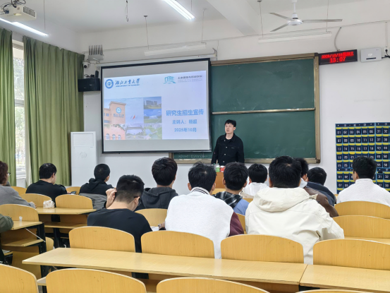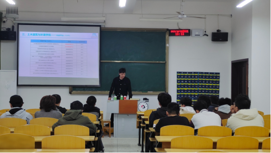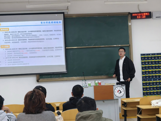 宣讲会上,杨超老师重点围绕近些年主攻的“绿色建筑材料研发”“结构工程抗震优化”“智能检测技术应用”等研究方向展开详细讲解,通过展示多项省部级科研项目成果、专利技术及学术论文,让在场学生直观感受到其科研实力与发展潜力。同时,杨超老师还结合招生政策,介绍了湖北工业大学土木工程专业的考研报名流程、复试侧重点及录取优势,为有意向报考的学生提供了清晰的参考方向。