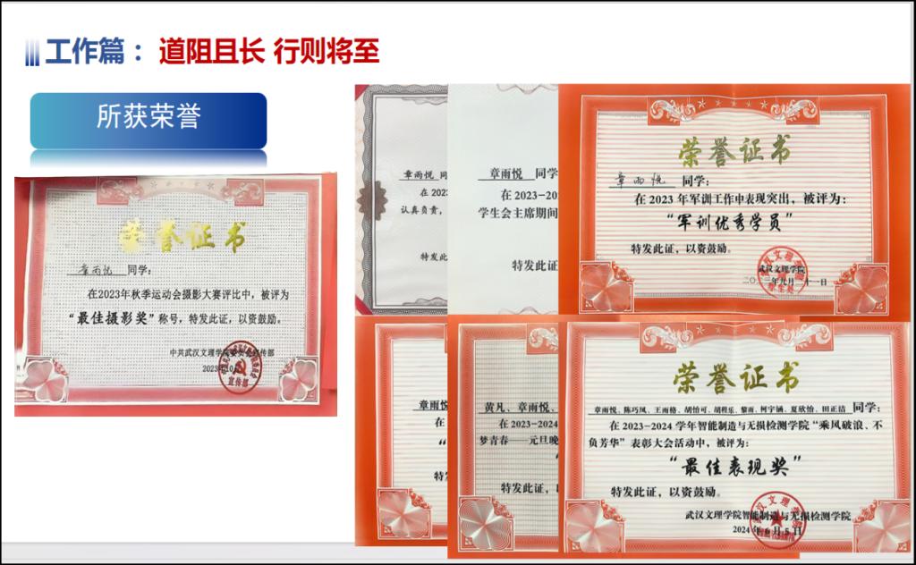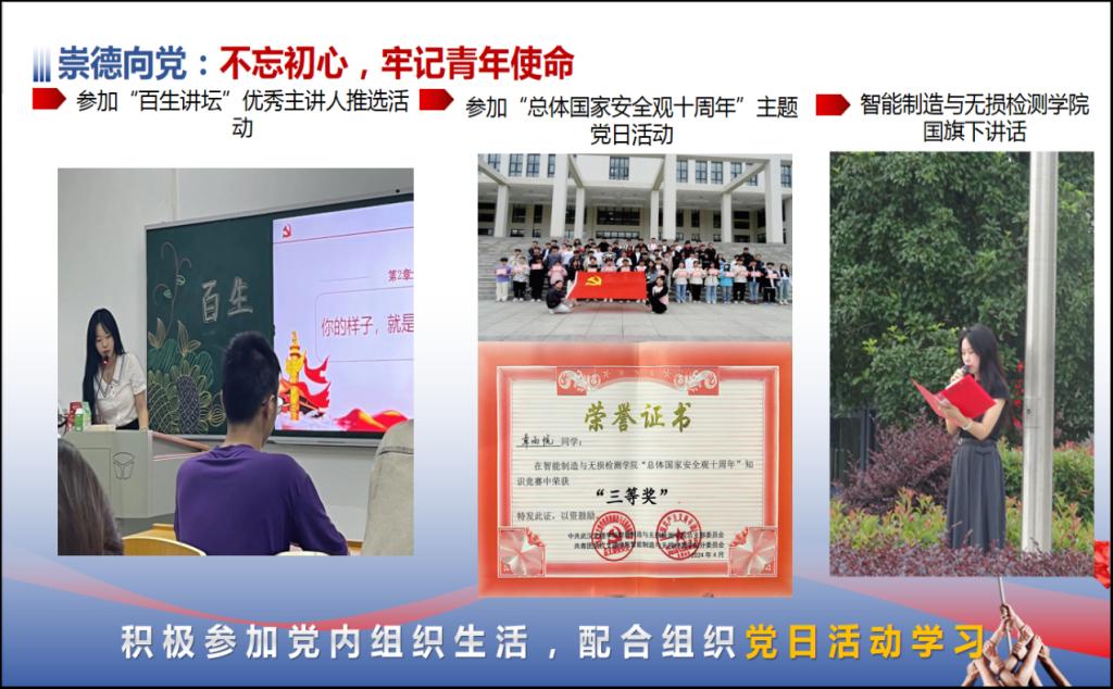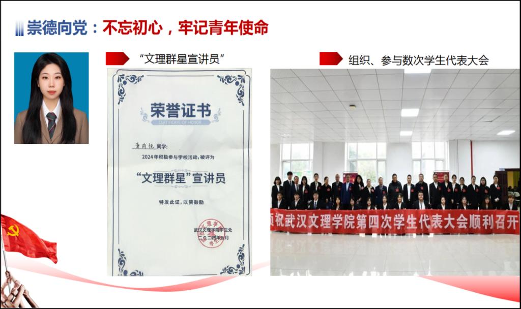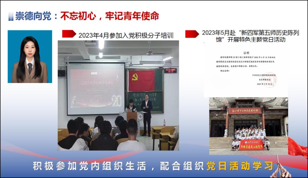 此外,章雨悦平时积极参加各类主题党团活动,作为学生代表在升旗仪式中发言,成为文理群星宣讲员为新生介绍成长经历,组织、参与学生代表大会等。她不断学习党的理论指导和先进知识,有着坚定的信念和远大的理想目标。