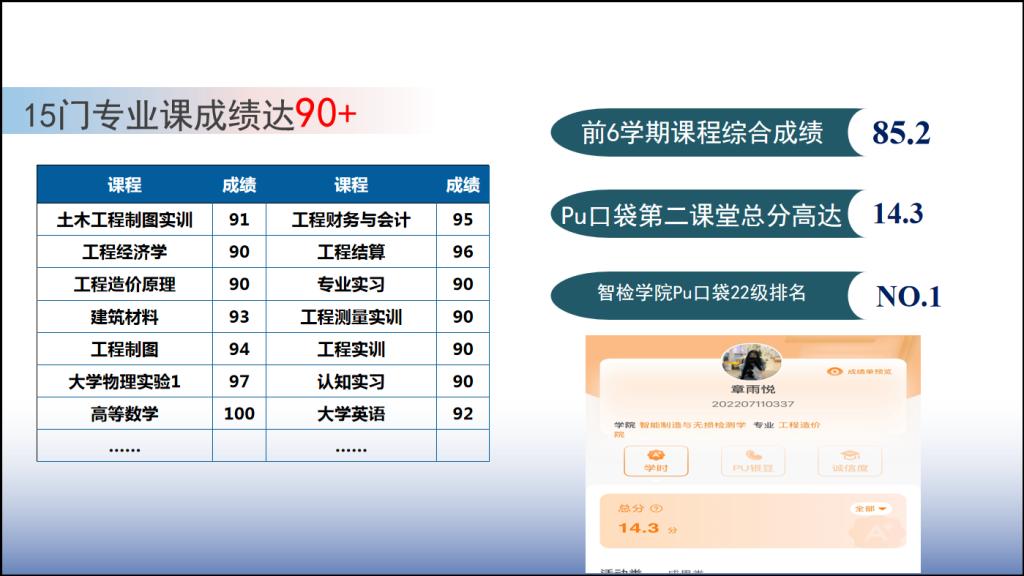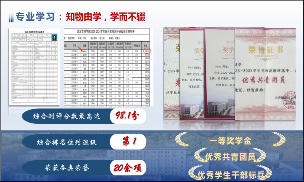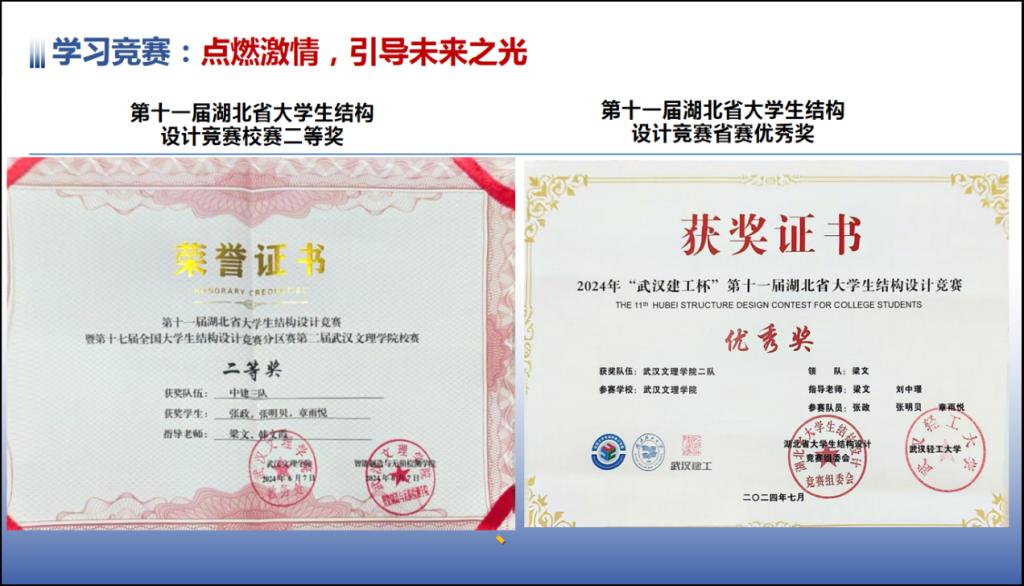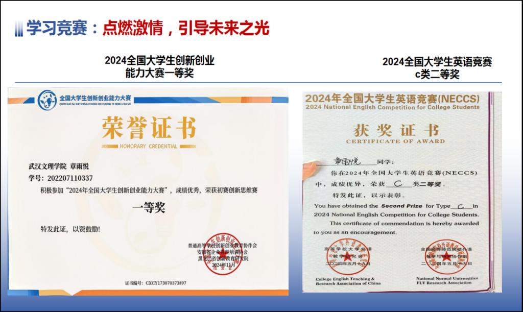 在课余时间,她努力提升个人综合能力,积极参加各类比赛,pu口袋第二课堂总分高达14.3分。同时,学术类竞赛获得了第十一届湖北省大学生结构设计竞赛校赛二等奖、省赛优秀奖、2024全国大学生创新创业能力大赛一等奖、2024全国大学生英语竞赛c类二等奖。
