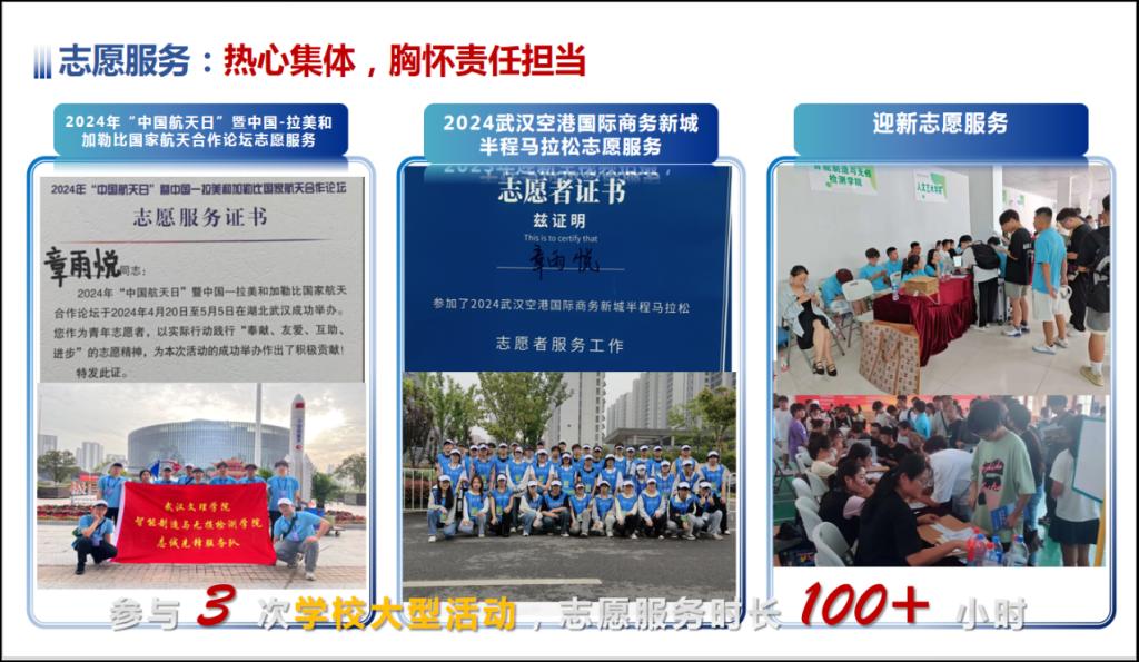 在实践工作上,章雨悦用“靡不有初、鲜克有终”来要求自己,她的志愿服务时长达到了100多个小时。例如2024年“中国航天日”国家航天合作论坛志愿服务、2024武汉新城半程马拉松志愿服务、2023年迎新志愿服务、“雷锋月”志愿服务主题党日活动,被评为优秀志愿者。